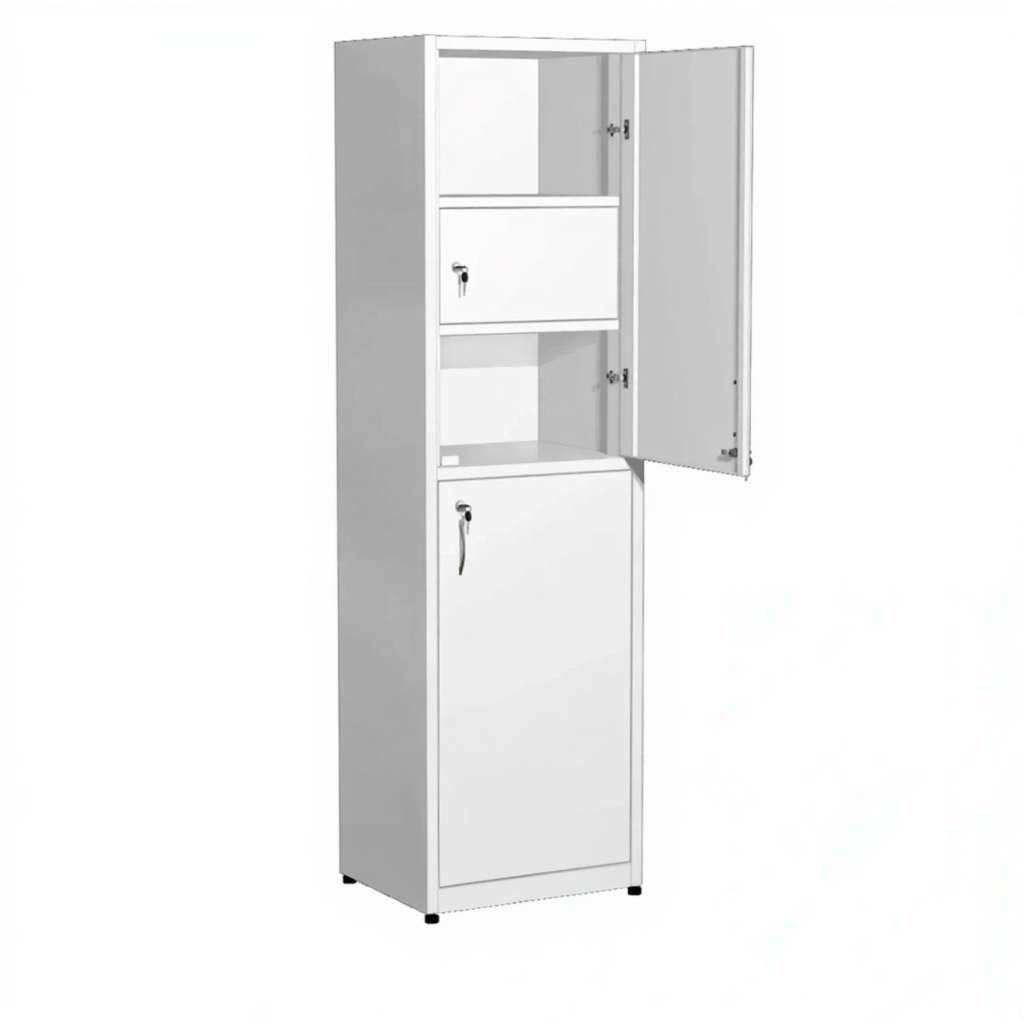 Шкаф металлический для медикаментов с сейфом ШдМп-4.1 (белый) активно используются в больницах, лабораториях, аптеках, где необходимо хранение медикаментов, медицинского инвентаря, одежды работников, приборов, больничной документации.