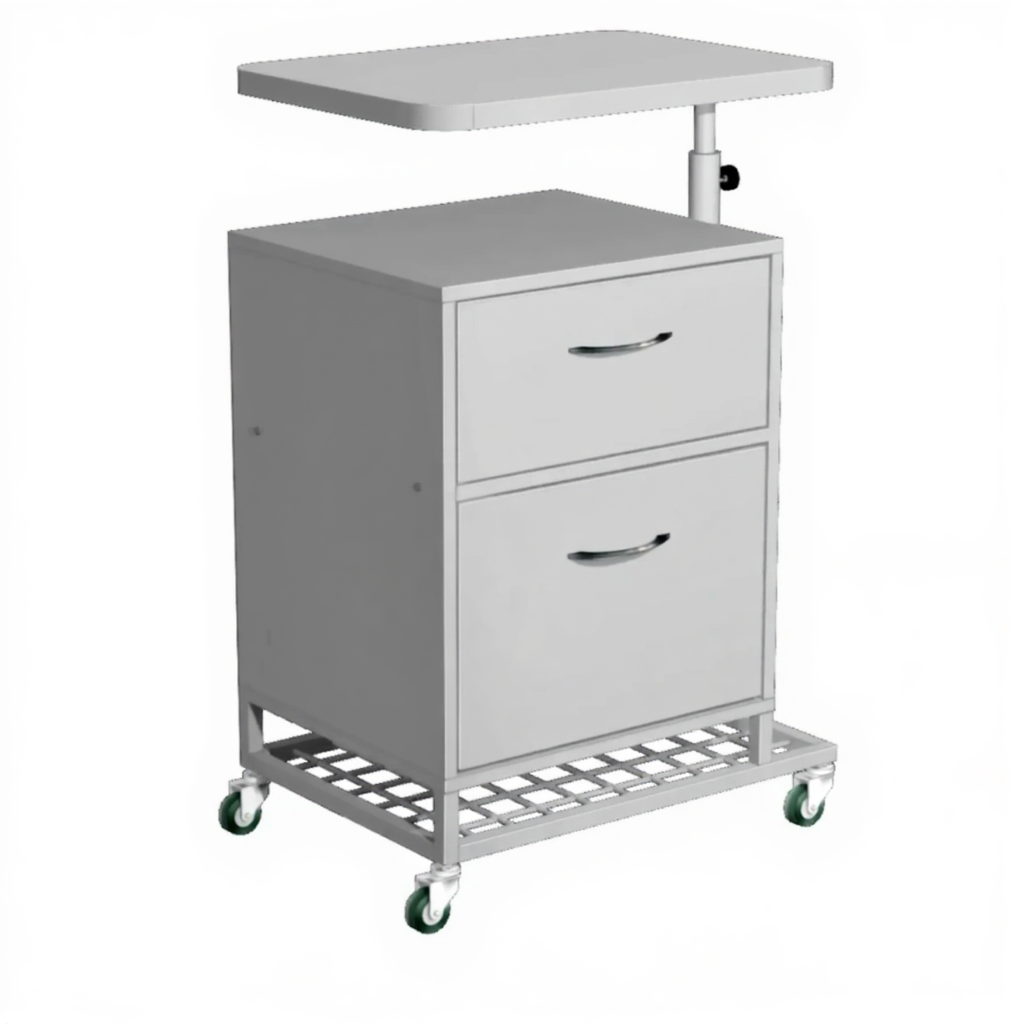 Тумба подкатная ТПМ-3 с надкроватным столиком (постформинг серый, ЛДСП серый, каркас серый) один из самых мобильных и практичных видов медицинской мебели. Предназначена для хранения личных вещей, одежды, документы, а также могут использоваться как приставной элемент мебели у рабочего стола или кровати.