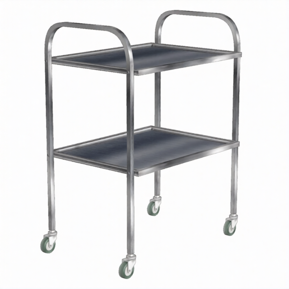 - Полностью нержавеющая сталь — каркас из профильной нержавеющей трубы 20×20 мм и две полки из нержавеющей стали, устойчивые к коррозии, воздействию дезинфицирующих средств и легкие в уходе.