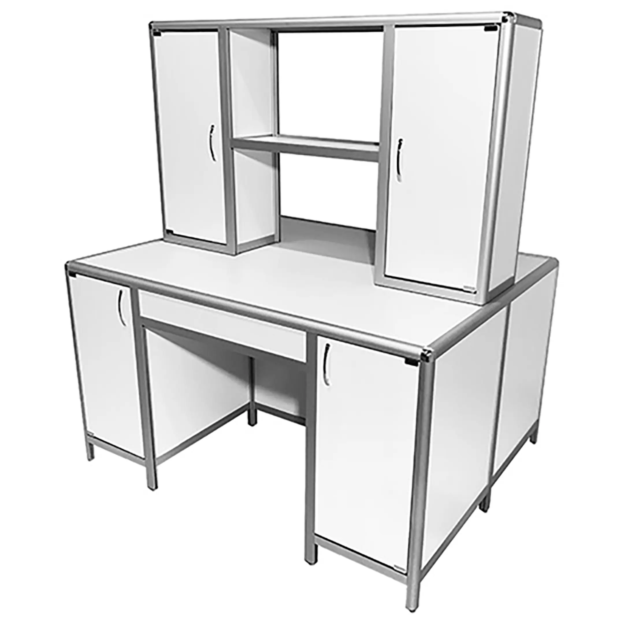 - Функциональная надстройка — каждое рабочее место снабжено надстройкой с двумя тумбами, имеющими распашные дверки и внутренние полки.