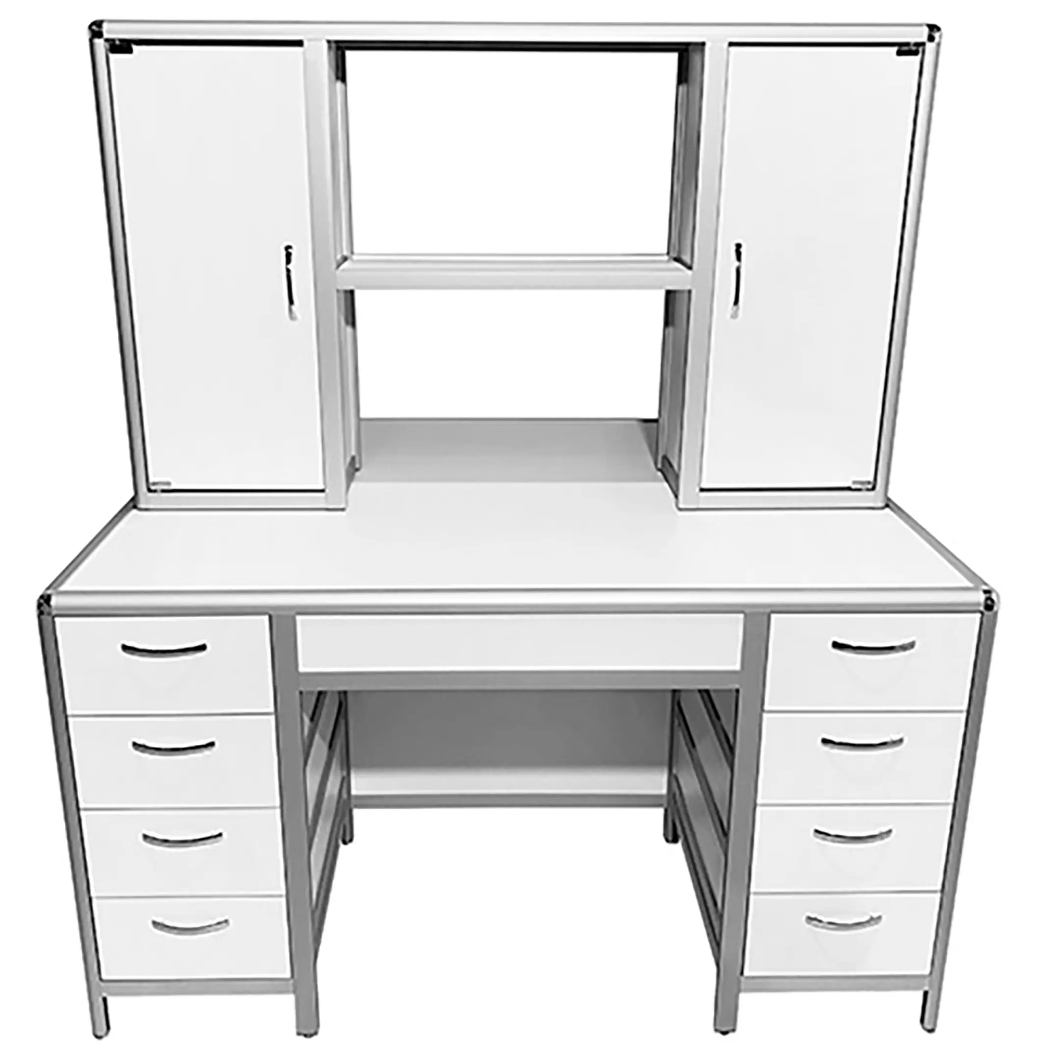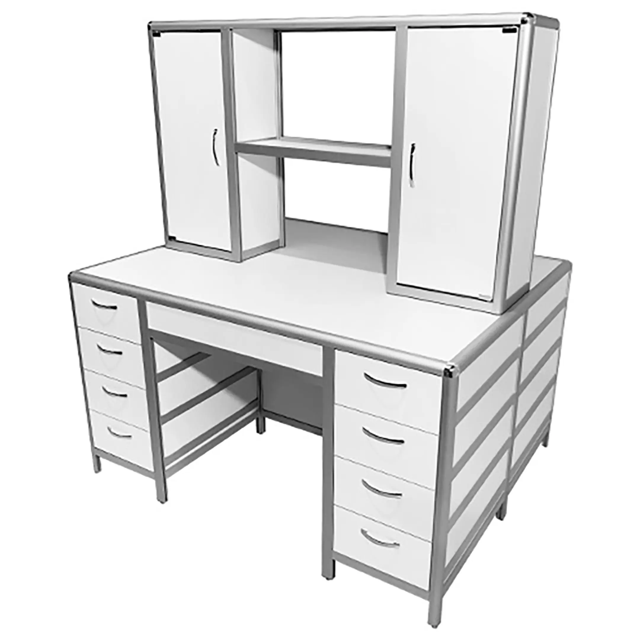 Стол лабораторный островной MED 11.005al с надстройкой (белый) — это удобное и функциональное решение для создания двух рабочих мест в лабораториях и медицинских учреждениях, позволяя эффективно использовать пространство помещения. Модель оснащена двумя рабочими местами, каждое с двумя боковыми тумбами, имеющими четыре выдвижных ящика, а также центральной надстройкой с двумя тумбами. Каркас выполнен из алюминиевого профиля, столешница из ЛДСП толщиной 22 мм.