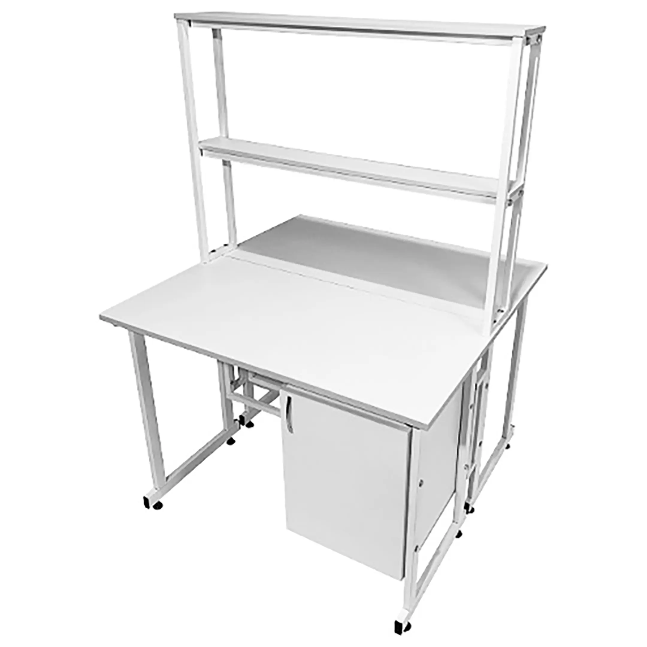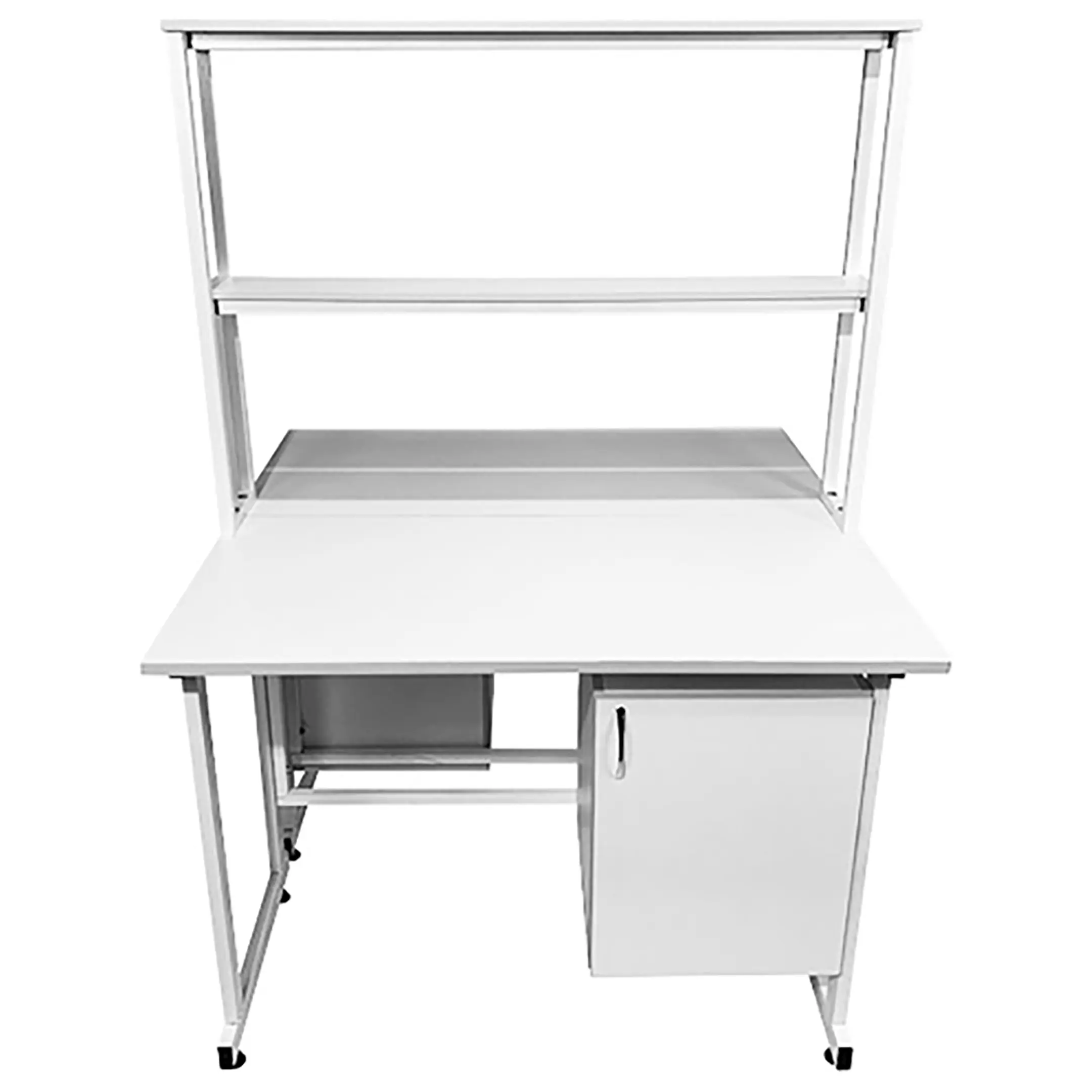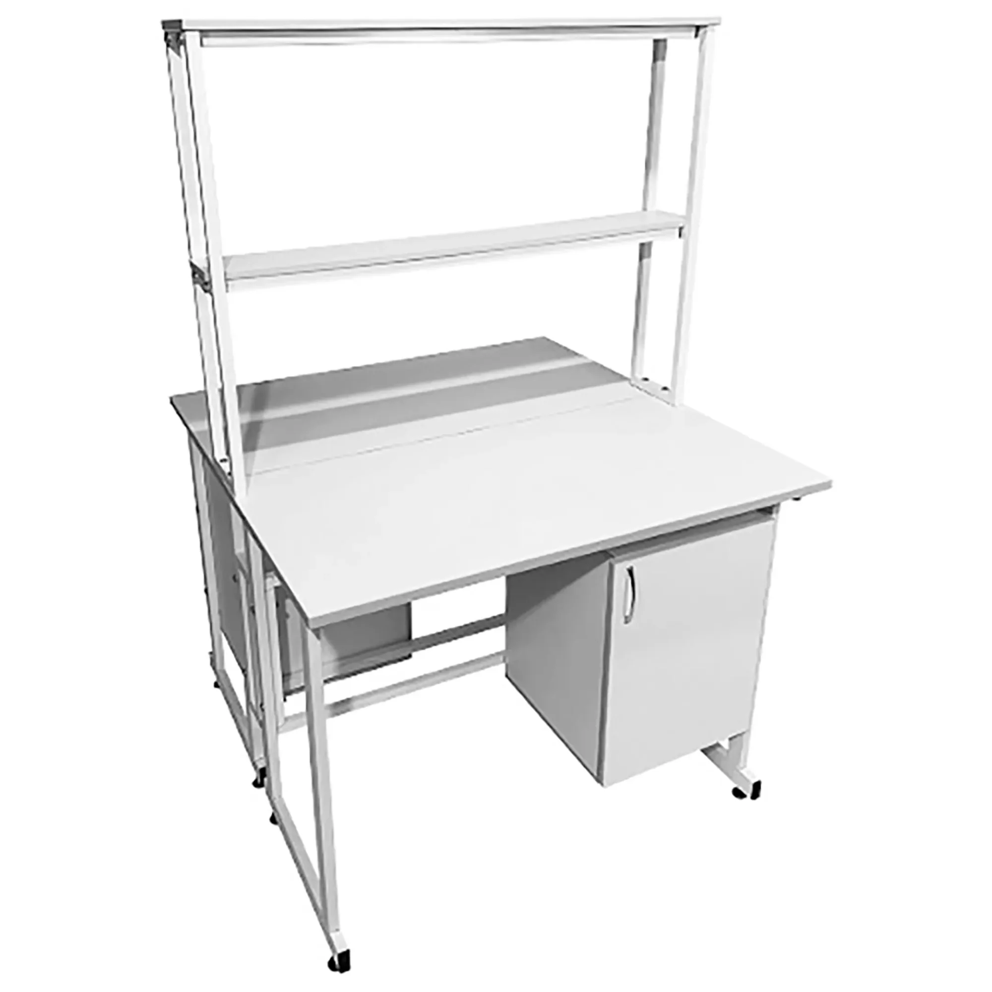 Стол лабораторный островной с надстройкой Сло 22.014 (белый) разработан для создания двух удобных и функциональных рабочих мест в лабораториях и медицинских учреждениях. Модель оснащена двумя рабочими местами, каждое с подвесной тумбой с распашной дверкой и полкой, и центральной надстройкой с двумя полками. Каркас выполнен из стального профиля, столешницы из ЛДСП толщиной 22 мм.