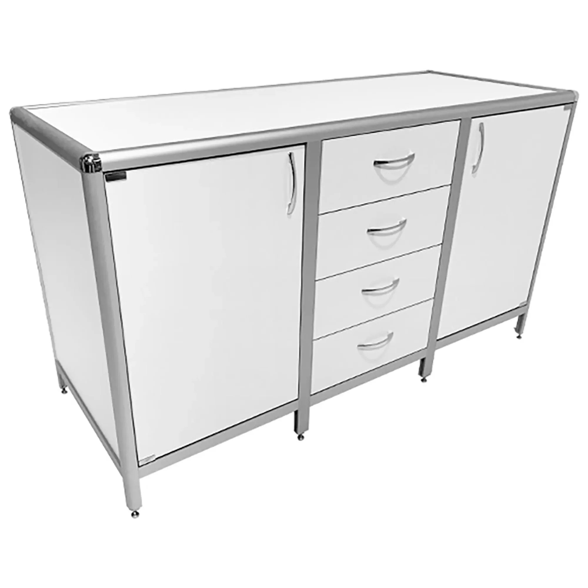 Стол-тумба лабораторная MED 12.021al (белый) — это функциональное решение для хранения лабораторного инвентаря, приборов и материалов в лабораториях и медицинских учреждениях. Модель разделена на три отдела: два боковых с дверкой и полкой, центральный с четырьмя выдвижными ящиками. Каркас выполнен из алюминиевого профиля, столешница из ЛДСП толщиной 16 мм.