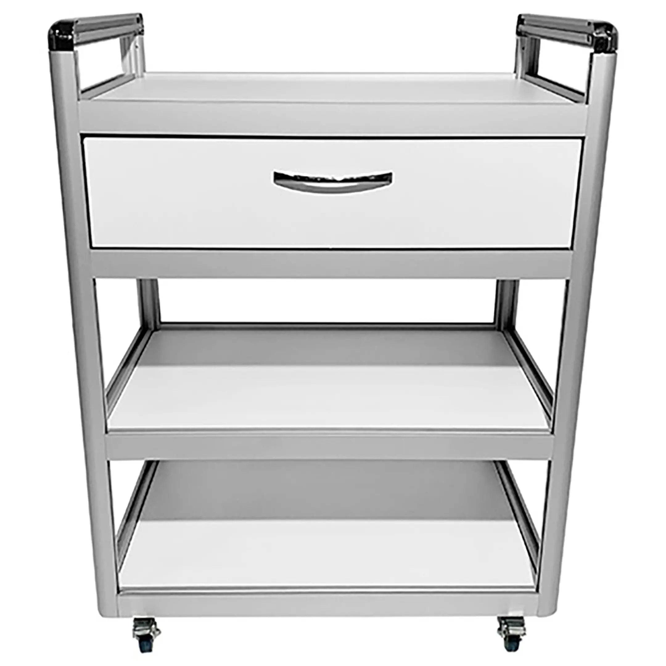 Столик лабораторный подкатной MED 14.002al (белый) — это удобное и надежное решение для временного размещения и удобного перемещения инструментов, предметов и приборов в медицинских учреждениях и лабораториях. Модель оснащена столешницей, нижними полками, выдвижным ящиком и колесными опорами. Каркас выполнен из алюминиевого профиля, столешница из ЛДСП.