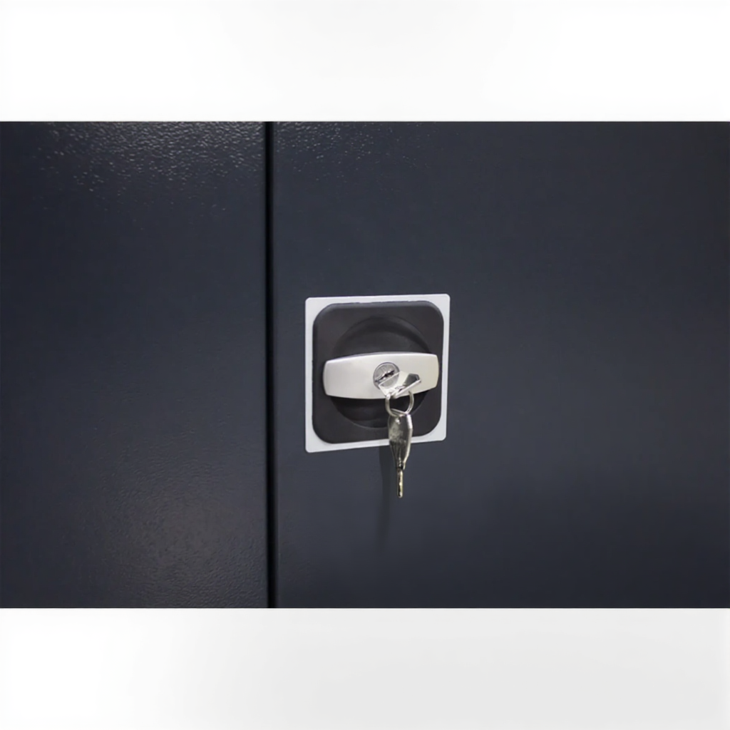 - Защита и безопасность — запирается на надежный замок с поворотной ручкой, порошковое покрытие устойчиво к механическим воздействиям и агрессивным жидкостям.