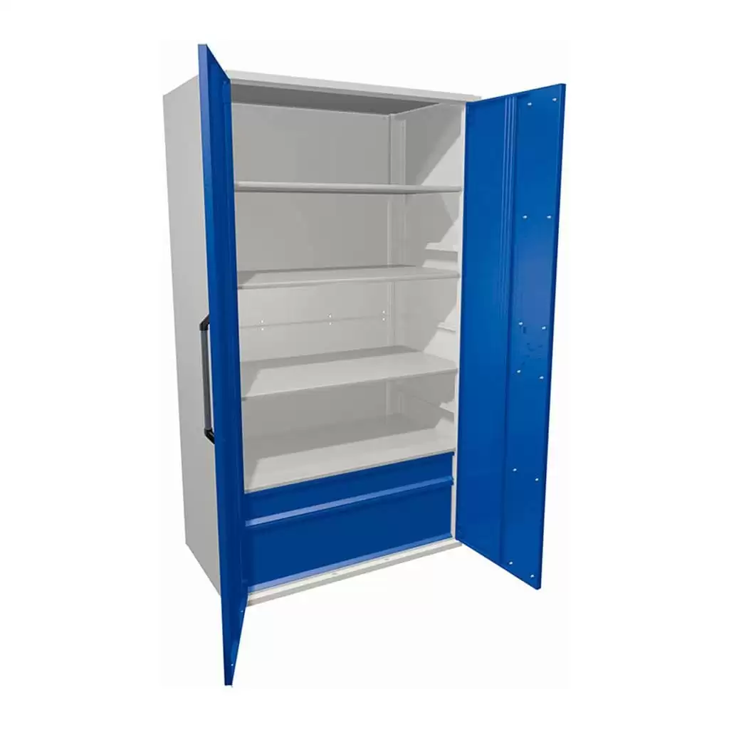 - Надежность и долговечность конструкции — шкаф изготовлен из высококачественных материалов: прочный каркас, устойчивые к нагрузкам полки, надежная фурнитура. Износостойкие покрытия обеспечивают длительный срок службы даже при интенсивном использовании в технической среде.