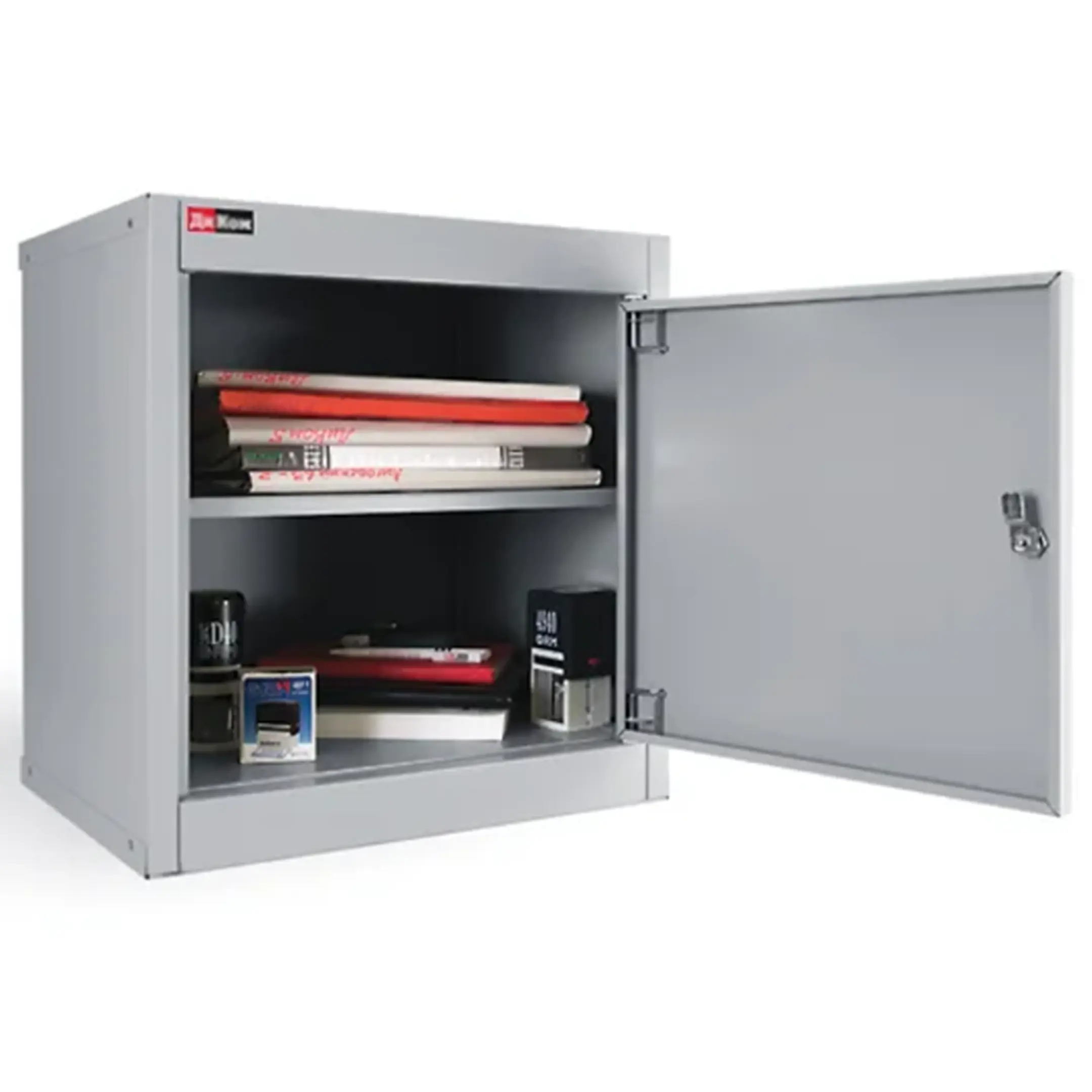 - Надежная и прочная конструкция — шкаф изготовлен из качественной листовой стали с антикоррозийным порошковым покрытием, что обеспечивает долговечность, устойчивость к механическим воздействиям и защиту содержимого. Распашная дверца оснащена надежным встроенным замком с ключом для обеспечения безопасности хранимых предметов.