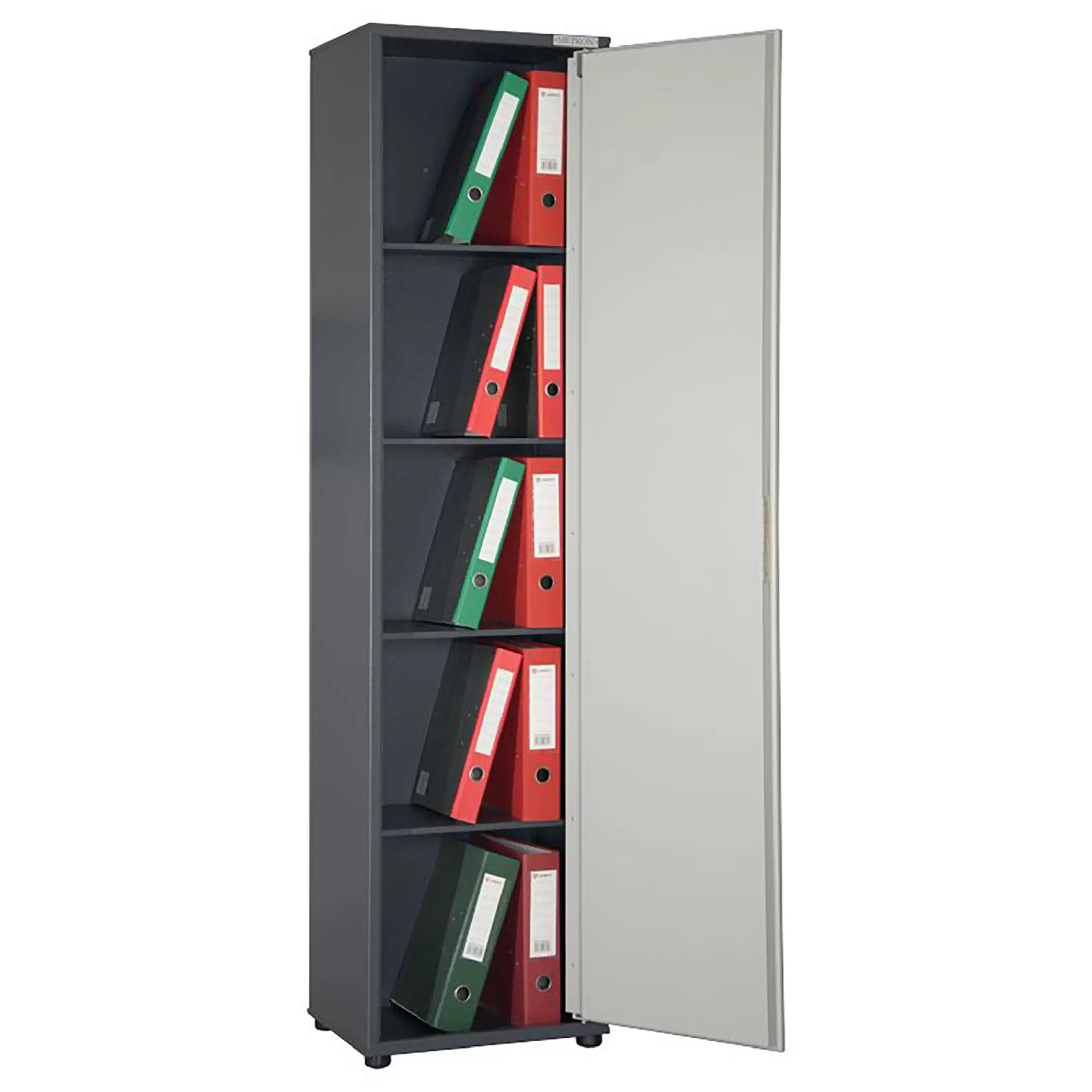 - Гибкая организация внутреннего пространства — шкаф оснащен системой регулируемых по высоте металлических полок, что позволяет оптимально распределять пространство под различные типы хранения: от папок-скоросшивателей и документов до крупных предметов и канцелярских принадлежностей.