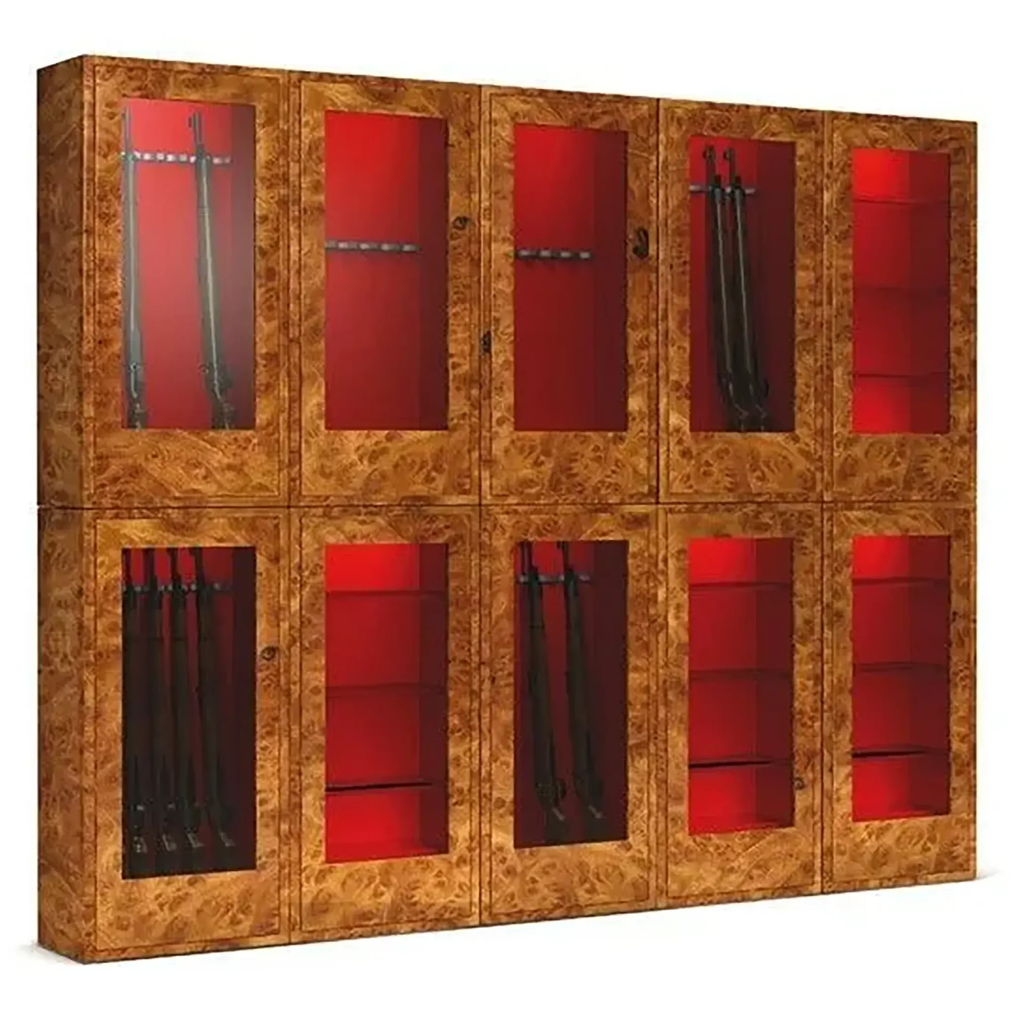 Сейф рассчитан для хранения 20 стволов. Сейф изготовлен в виде витрины, стекло установлено бронированное. Модульная система дает возможность составлять разные комбинации, при различных задачах в дизайне интерьера.