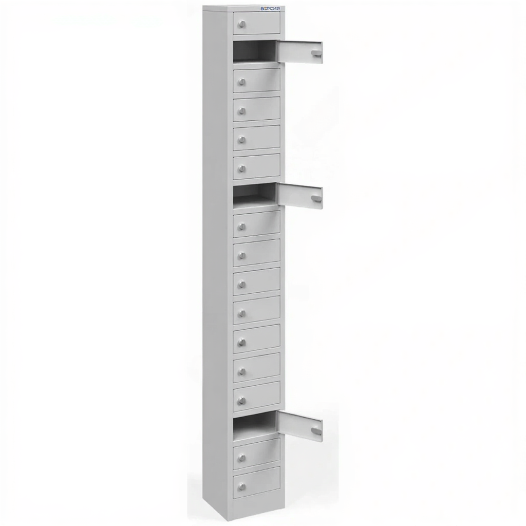 - Надежная защита в компактном формате — несмотря на малый размер, каждая ячейка оборудована собственным замком, а общая конструкция выполнена из прочного металла. Это гарантирует безопасное хранение устройств от кражи и несанкционированного доступа, отвечая требованиям учреждений и предприятий.