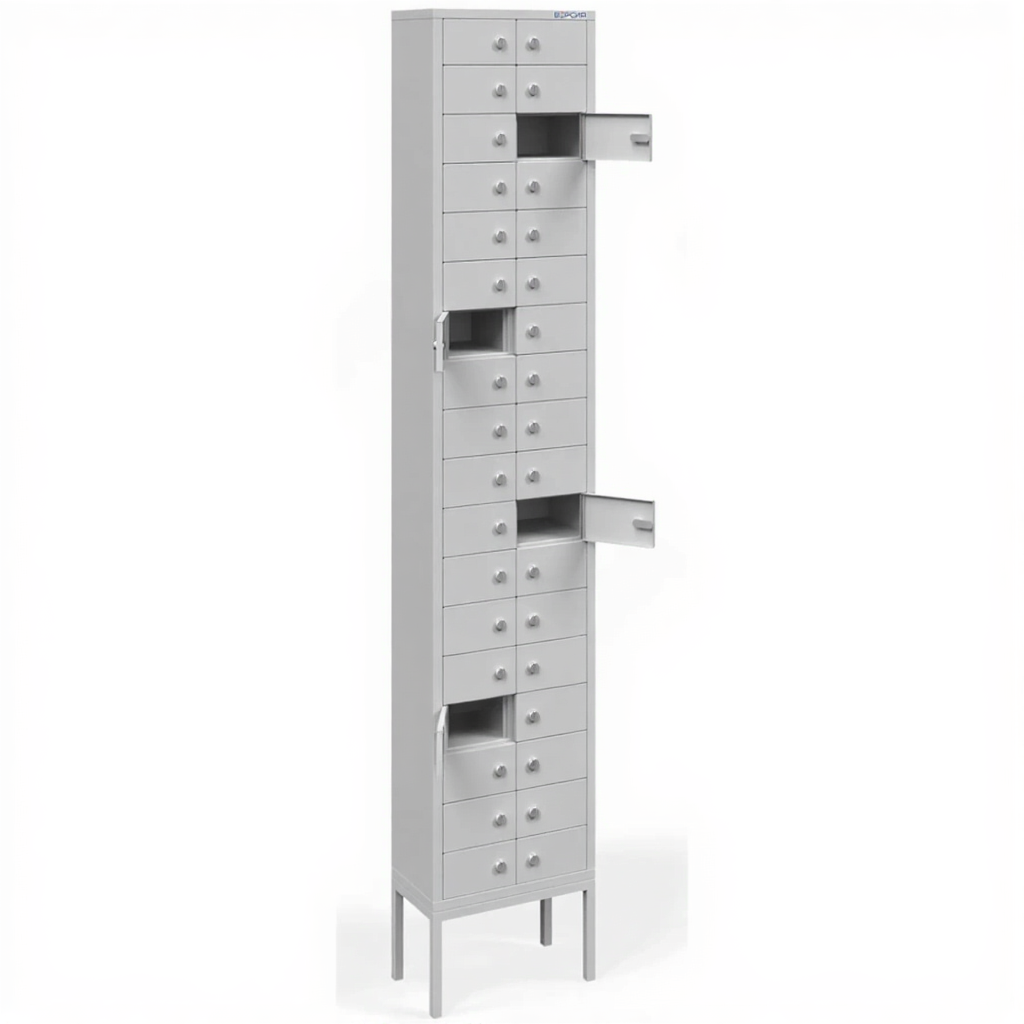 - Комплектная поставка и эргономичная высота — в комплект входит специальная подставка, которая приподнимает шкаф на оптимальную для использования высоту. Это избавляет от необходимости поиска дополнительной мебели для установки, обеспечивает удобный доступ к ячейкам без наклонов для пользователей любого роста и придает оборудованию законченный, профессиональный вид.
