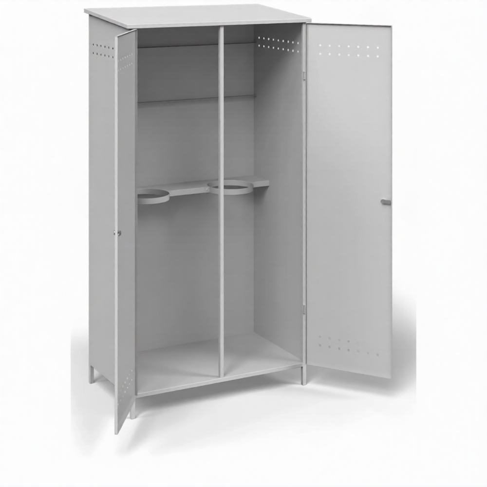 Шкаф металлический для 2-х газовых баллонов ШГБК-V1 усиленный с уголком — это функциональное, надежное и хорошо организованное решение для безопасного хранения и защиты пары газовых баллонов с возможностью крепления редуктора и организации ввода/вывода коммуникаций. Модель представляет собой усиленный стальной защитный шкаф серии «V1», где конструктивная особенность — наличие монтажного уголка — позволяет удобно и надежно закрепить газовый редуктор на внешней или внутренней стороне шкафа. Вместимость на два баллона идеально подходит для базовых сварочных или ремонтных работ. Конструкция разработана для строгого соблюдения правил пожарной и промышленной безопасности, обеспечивая комплексную защиту оборудования и удобство эксплуатации.